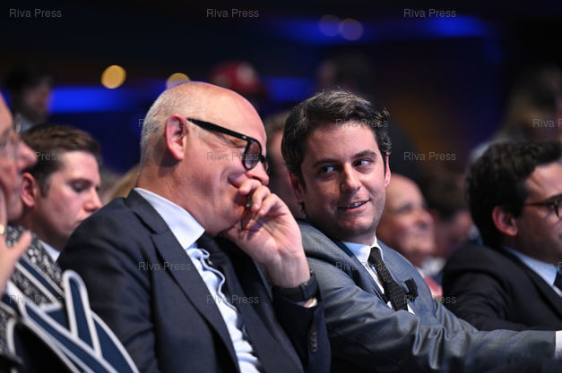 Légende : Meeting de campagne de la majorité présidentielle pour les élections européennes à la Maison de la Mutualité. Edouard Philippe - Gabriel Attal /// Campaign meeting of the presidential majority for the European elections at the Maison de la Mutualité. Edouard Philippe, former prime minister - Gabriel Attal, prime minister - Paris - 07/05/2024 - Photo © Lionel Préau +33 (0)6 68 12 83 77