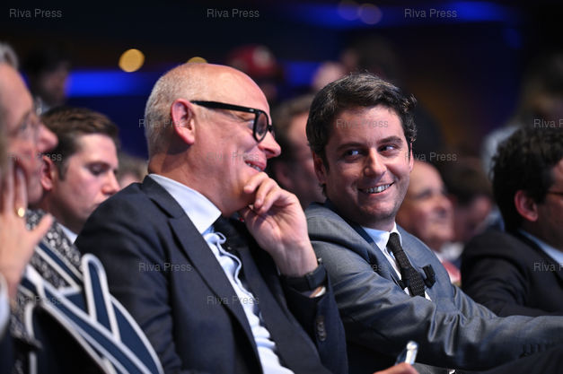 Légende : Meeting de campagne de la majorité présidentielle pour les élections européennes à la Maison de la Mutualité. Edouard Philippe - Gabriel Attal /// Campaign meeting of the presidential majority for the European elections at the Maison de la Mutualité. Edouard Philippe, former prime minister - Gabriel Attal, prime minister - Paris - 07/05/2024 - Photo © Lionel Préau +33 (0)6 68 12 83 77