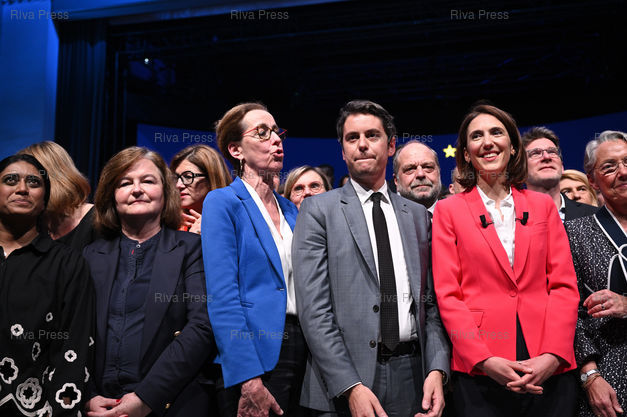 Légende : Meeting de campagne de la majorité présidentielle pour les élections européennes à la Maison de la Mutualité. Prisca Thevenot - Nathalie Loiseau - Fabienne Keller - Gabriel Attal - Valérie Hayer - Elisabeth Borne /// Campaign meeting of the presidential majority for the European elections at the Maison de la Mutualité. Prisca Thevenot, Minister Delegate for Democratic Renewal, Government Spokesperson - Nathalie Loiseau, MEP - Fabienne Keller , MEP - Gabriel Attal, prime minister - Valérie Hayer, head of list - Elisabeth Borne, former Prime Minister - Paris - 07/05/2024 - Photo © Lionel Préau +33 (0)6 68 12 83 77