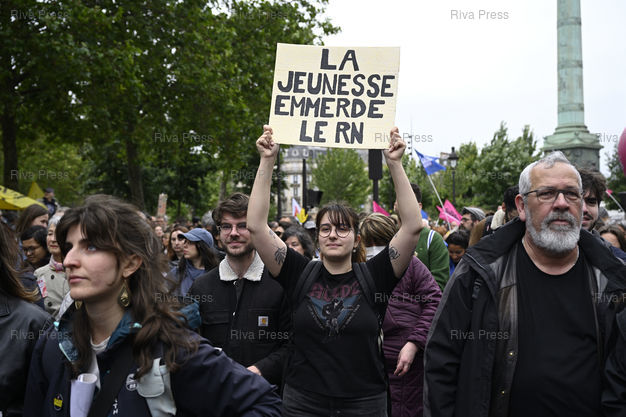 Légende : Manifestation contre l'extrême droite, arrivée largement en tête aux élections européennes, conduisant le Président de la République à dissoudre l'Assemblée nationale. "La jeunesse emmerde le RN" /// Demonstration against the far right, which came well ahead in the European elections, leading the President of the Republic to dissolve the National Assembly. “Youth annoys the RNî - Paris - 15/06/2024 - Photo © Lionel Préau +33 (0)6 68 12 83 77