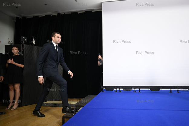 Légende : Déclaration de Jordan Bardella, président du RN, après les résultats du 1er tour des élections législatives /// Statement from Jordan Bardella, President of the Rassemblement National far-right party, after the results of the first round of the legislative elections - Paris - 30/06/2024 - Photo © Lionel Préau +33 (0)6 68 12 83 77