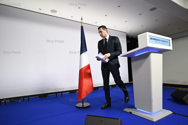 Légende : Déclaration de Jordan Bardella, président du RN, après les résultats du 1er tour des élections législatives /// Statement from Jordan Bardella, President of the Rassemblement National far-right party, after the results of the first round of the legislative elections - Paris - 30/06/2024 - Photo © Lionel Préau +33 (0)6 68 12 83 77