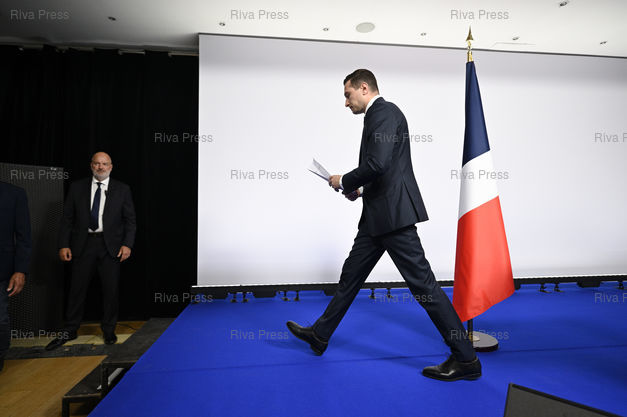 Légende : Déclaration de Jordan Bardella, président du RN, après les résultats du 1er tour des élections législatives /// Statement from Jordan Bardella, President of the Rassemblement National far-right party, after the results of the first round of the legislative elections - Paris - 30/06/2024 - Photo © Lionel Préau +33 (0)6 68 12 83 77