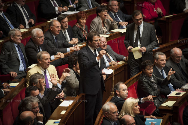 Légende : 16/10/2012 - PARIS, France - Le president du groupe UMP Christian Jacob pendant la seance de questions au gouvernement a l'Assemblee Nationale. /// The head of UMP group Christian Jacob at the French National Assembly in Paris. /// PHOTO Vincent BOISOT/Riva Press