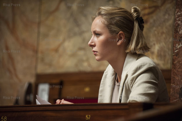 Légende : 16/10/2012 - PARIS, France - La deputee Front Nationale Marion Marechal Le Pen pendant la seance de questions au gouvernement a l'Assemblee Nationale. . /// French Front National deputy Marion Marechal Le Pen at the French National Assembly in Paris. /// PHOTO Vincent BOISOT/Riva Press