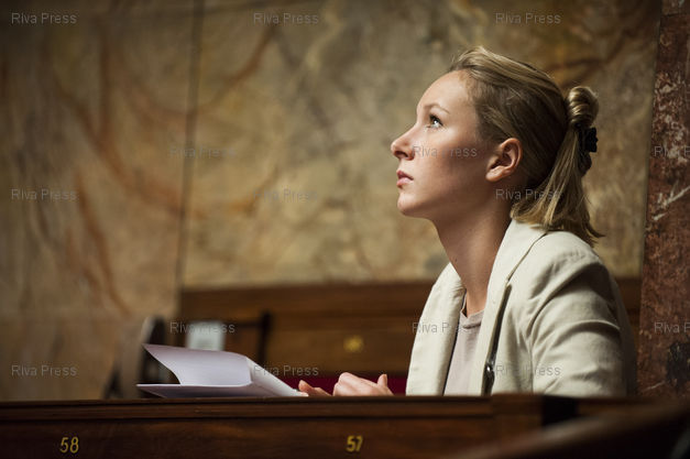 Légende : 16/10/2012 - PARIS, France - La deputee Front Nationale Marion Marechal Le Pen pendant la seance de questions au gouvernement a l'Assemblee Nationale. . /// French Front National deputy Marion Marechal Le Pen at the French National Assembly in Paris. /// PHOTO Vincent BOISOT/Riva Press