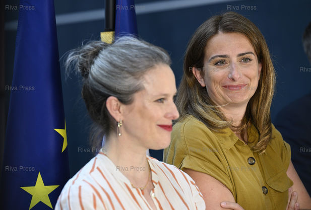 Légende : Des forces de gauche se réunissent en vue d'une candidature commune à la présidentielle, à l'appel de Lucie Castets, ex-candidate du NFP. Lucie Castets, Marine Tondelier (Les Ecologistes) /// Left-wing forces are coming together to form a joint presidential candidate, at the request of Lucie Castets, a former NFP (Nouveau Front Populaire) candidate. Lucie Castets, Marine Tondelier (Les Ecologistes) - Bagneux - 02/07/2025 - Photo © Lionel Préau +33 (0)6 68 12 83 77