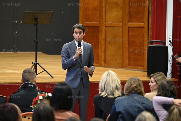 Légende : Gabriel Attal, ministre de l'Éducation nationale et de la Jeunesse, Brigitte Macron et Olena Zelenska, épouse du président Ukrainien, se rendent dans une école parisienne accueillant des enfants ukrainiens /// Gabriel Attal, Minister of National Education and Youth, Brigitte Macron and Olena Zelenska, wife of the Ukrainian president, visit a Parisian school welcoming Ukrainian children - Paris - 09/11/2023 - Photo © Lionel Préau +33 (0)6 68 12 83 77