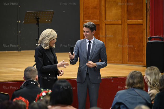 Légende : Gabriel Attal, ministre de l'Éducation nationale et de la Jeunesse, Brigitte Macron et Olena Zelenska, épouse du président Ukrainien, se rendent dans une école parisienne accueillant des enfants ukrainiens /// Gabriel Attal, Minister of National Education and Youth, Brigitte Macron and Olena Zelenska, wife of the Ukrainian president, visit a Parisian school welcoming Ukrainian children - Paris - 09/11/2023 - Photo © Lionel Préau +33 (0)6 68 12 83 77