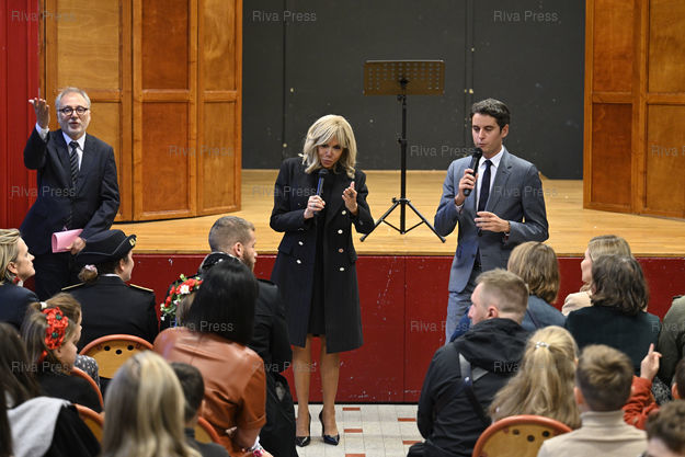 Légende : Gabriel Attal, ministre de l'Éducation nationale et de la Jeunesse, Brigitte Macron et Olena Zelenska, épouse du président Ukrainien, se rendent dans une école parisienne accueillant des enfants ukrainiens /// Gabriel Attal, Minister of National Education and Youth, Brigitte Macron and Olena Zelenska, wife of the Ukrainian president, visit a Parisian school welcoming Ukrainian children - Paris - 09/11/2023 - Photo © Lionel Préau +33 (0)6 68 12 83 77