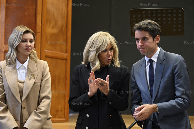 Légende : Gabriel Attal, ministre de l'Éducation nationale et de la Jeunesse, Brigitte Macron et Olena Zelenska, épouse du président Ukrainien, se rendent dans une école parisienne accueillant des enfants ukrainiens /// Gabriel Attal, Minister of National Education and Youth, Brigitte Macron and Olena Zelenska, wife of the Ukrainian president, visit a Parisian school welcoming Ukrainian children - Paris - 09/11/2023 - Photo © Lionel Préau +33 (0)6 68 12 83 77