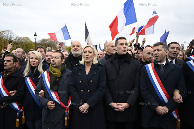 Caption : Marche contre l'antisémitisme, lancée par la présidente de l'Assemblée nationale et le président du Sénat, en réponse à la flambée d'actes antisémites qui touche la France depuis l'attaque du Hamas contre Israël. Hélène Laporte, Sébastien Chenu, Marine Le Pen, Jordan Bardella, Franck Allisio, Rassemblement national /// March against anti-Semitism, launched by the President of the National Assembly and the President of the Senate, in response to the outbreak of anti-Semitic acts which has affected France since the Hamas attack on Israel. Hélène Laporte, Sébastien Chenu, Marine Le Pen, Jordan Bardella, Franck Allisio, Rassemblement national party - Paris - 12/11/2023 - Photo © Lionel Préau +33 (0)6 68 12 83 77