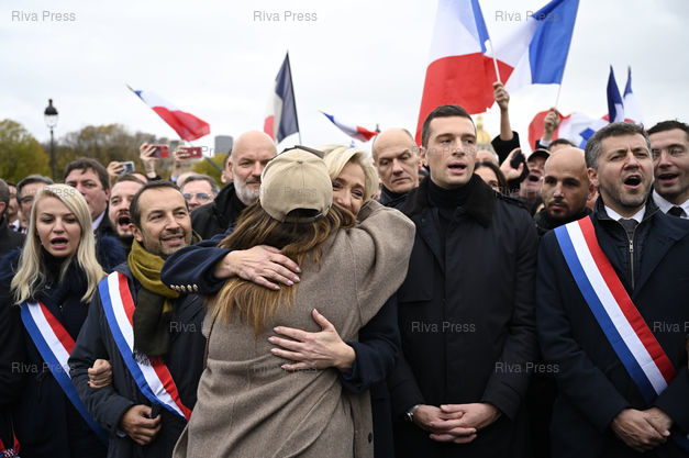 Caption : Marche contre l'antisémitisme, lancée par la présidente de l'Assemblée nationale et le président du Sénat, en réponse à la flambée d'actes antisémites qui touche la France depuis l'attaque du Hamas contre Israël. Hélène Laporte, Sébastien Chenu, Marine Le Pen, Jordan Bardella, Franck Allisio, Rassemblement national /// March against anti-Semitism, launched by the President of the National Assembly and the President of the Senate, in response to the outbreak of anti-Semitic acts which has affected France since the Hamas attack on Israel. Hélène Laporte, Sébastien Chenu, Marine Le Pen, Jordan Bardella, Franck Allisio, Rassemblement national party - Paris - 12/11/2023 - Photo © Lionel Préau +33 (0)6 68 12 83 77