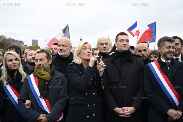 Caption : Marche contre l'antisémitisme, lancée par la présidente de l'Assemblée nationale et le président du Sénat, en réponse à la flambée d'actes antisémites qui touche la France depuis l'attaque du Hamas contre Israël. Hélène Laporte, Sébastien Chenu, Marine Le Pen, Jordan Bardella, Franck Allisio, Rassemblement national /// March against anti-Semitism, launched by the President of the National Assembly and the President of the Senate, in response to the outbreak of anti-Semitic acts which has affected France since the Hamas attack on Israel. Hélène Laporte, Sébastien Chenu, Marine Le Pen, Jordan Bardella, Franck Allisio, Rassemblement national party - Paris - 12/11/2023 - Photo © Lionel Préau +33 (0)6 68 12 83 77