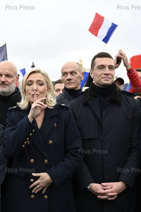 Caption : Marche contre l'antisémitisme, lancée par la présidente de l'Assemblée nationale et le président du Sénat, en réponse à la flambée d'actes antisémites qui touche la France depuis l'attaque du Hamas contre Israël. Hélène Laporte, Sébastien Chenu, Marine Le Pen, Jordan Bardella, Franck Allisio, Rassemblement national /// March against anti-Semitism, launched by the President of the National Assembly and the President of the Senate, in response to the outbreak of anti-Semitic acts which has affected France since the Hamas attack on Israel. Hélène Laporte, Sébastien Chenu, Marine Le Pen, Jordan Bardella, Franck Allisio, Rassemblement national party - Paris - 12/11/2023 - Photo © Lionel Préau +33 (0)6 68 12 83 77