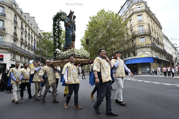 Légende : Procession en l'honneur de l'Assomption dans les rues du Vème arrondissement de Paris par les catholiques traditionalistes de l'église Saint-Nicolas-du-Chardonnet /// Procession in honor of the Assumption in the streets of the 5th arrondissement of Paris by the traditionalist Catholics of the church of Saint-Nicolas-du-Chardonnet - Paris - 15/08/2023 - Photo © Lionel Préau +33 (0)6 68 12 83 77