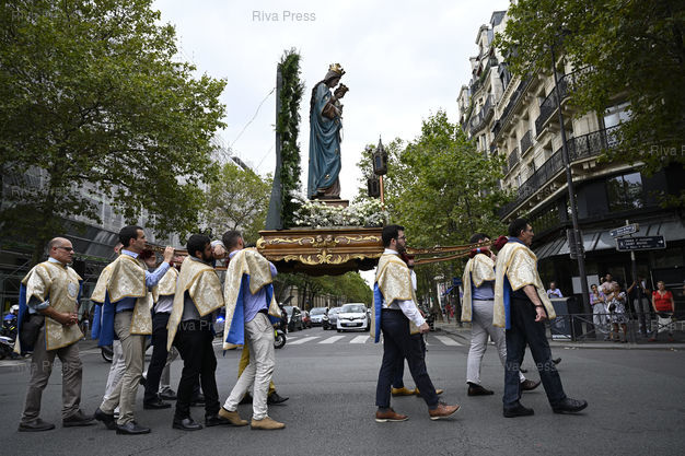 Légende : Procession en l'honneur de l'Assomption dans les rues du Vème arrondissement de Paris par les catholiques traditionalistes de l'église Saint-Nicolas-du-Chardonnet /// Procession in honor of the Assumption in the streets of the 5th arrondissement of Paris by the traditionalist Catholics of the church of Saint-Nicolas-du-Chardonnet - Paris - 15/08/2023 - Photo © Lionel Préau +33 (0)6 68 12 83 77