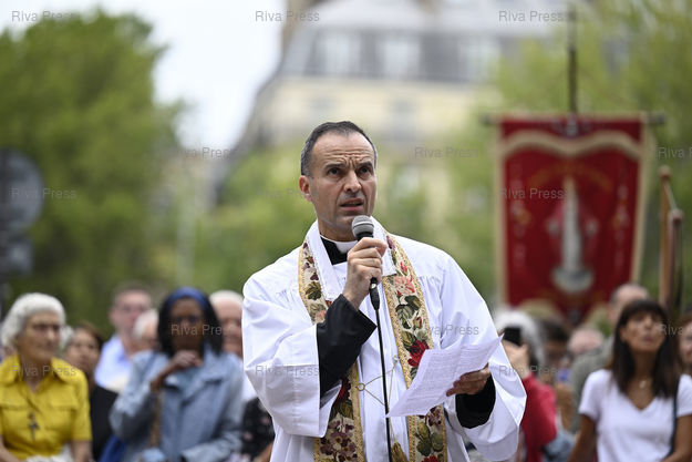 Légende : Procession en l'honneur de l'Assomption dans les rues du Vème arrondissement de Paris par les catholiques traditionalistes de l'église Saint-Nicolas-du-Chardonnet. Abbé Michel Frament /// Procession in honor of the Assumption in the streets of the 5th arrondissement of Paris by the traditionalist Catholics of the church of Saint-Nicolas-du-Chardonnet. Father Michel Frament - Paris - 15/08/2023 - Photo © Lionel Préau +33 (0)6 68 12 83 77