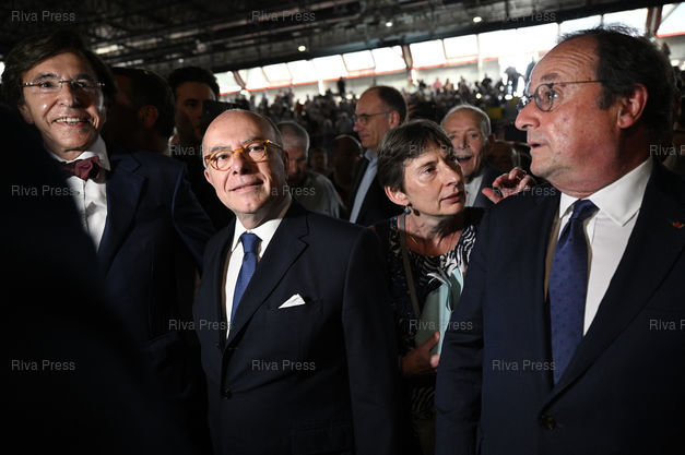 Légende : Premier meeting de "La Convention", mouvement de gauche anti-Nupes lancé en dehors du Parti socialiste par l'ancien Premier ministre Bernard Cazeneuve dans la perspective de la prochaine présidentielle - Palais des sports de Créteil. Elio di Rupo - Bernard Cazeneuve - Clotilde Valter - François Hollande /// First meeting of "La Convention", a left-wing anti-Nupes movement launched outside the Socialist Party by former Prime Minister Bernard Cazeneuve in view of the next presidential election. Elio di Rupo - Bernard Cazeneuve - Clotilde Valter - François Hollande - Créteil - 10/06/2023 - Photo © Lionel Préau +33 (0)6 68 12 83 77