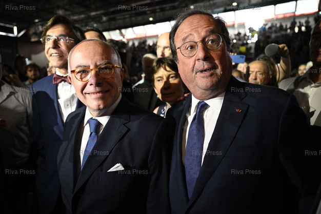 Caption : Premier meeting de "La Convention", mouvement de gauche anti-Nupes lancé en dehors du Parti socialiste par l'ancien Premier ministre Bernard Cazeneuve dans la perspective de la prochaine présidentielle - Palais des sports de Créteil. Bernard Cazeneuve - François Hollande /// First meeting of "La Convention", a left-wing anti-Nupes movement launched outside the Socialist Party by former Prime Minister Bernard Cazeneuve in view of the next presidential election. Bernard Cazeneuve - François Hollande - Créteil - 10/06/2023 - Photo © Lionel Préau +33 (0)6 68 12 83 77