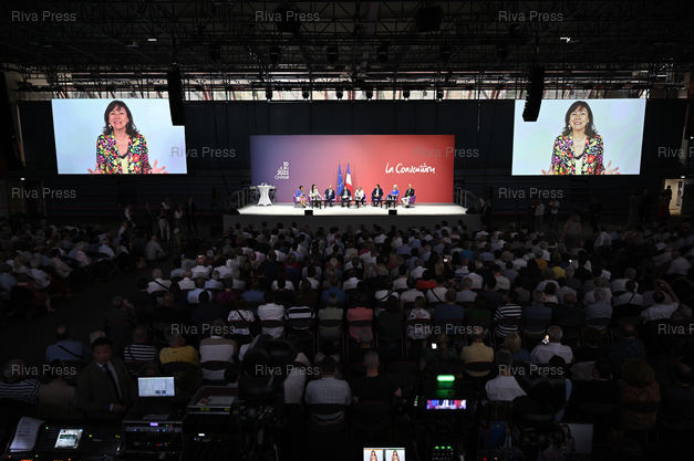 Légende : Premier meeting de "La Convention", mouvement de gauche anti-Nupes lancé en dehors du Parti socialiste par l'ancien Premier ministre Bernard Cazeneuve dans la perspective de la prochaine présidentielle - Palais des sports de Créteil. Carole Delga, présidente de la région Occitanie (en vidéo) /// First meeting of "La Convention", a left-wing anti-Nupes movement launched outside the Socialist Party by former Prime Minister Bernard Cazeneuve in view of the next presidential election. Carole Delga, president of the Occitanie region (in video) - Créteil - 10/06/2023 - Photo © Lionel Préau +33 (0)6 68 12 83 77