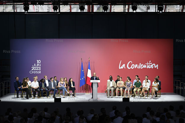 Caption : Premier meeting de "La Convention", mouvement de gauche anti-Nupes lancé en dehors du Parti socialiste par l'ancien Premier ministre Bernard Cazeneuve dans la perspective de la prochaine présidentielle - Palais des sports de Créteil. /// First meeting of "La Convention", a left-wing anti-Nupes movement launched outside the Socialist Party by former Prime Minister Bernard Cazeneuve in view of the next presidential election. - Créteil - 10/06/2023 - Photo © Lionel Préau +33 (0)6 68 12 83 77