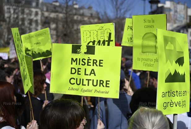 Légende : Les professionnels du secteur culturel en grève manifestent à l'appel de l'Intersyndicale du spectacle vivant pour dénoncer une politique d’austérité /// Cultural sector professionals on strike are demonstrating at the call of the Intersyndicale du spectacle vivant to denounce an austerity policy - Paris - 20/03/2025 - Photo © Lionel Préau +33 (0)6 68 12 83 77
