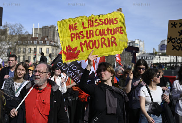 Légende : Les professionnels du secteur culturel en grève manifestent à l'appel de l'Intersyndicale du spectacle vivant pour dénoncer une politique d’austérité /// Cultural sector professionals on strike are demonstrating at the call of the Intersyndicale du spectacle vivant to denounce an austerity policy - Paris - 20/03/2025 - Photo © Lionel Préau +33 (0)6 68 12 83 77