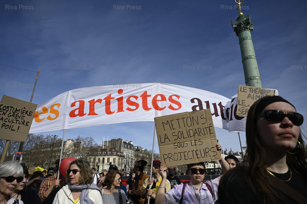 Légende : Les professionnels du secteur culturel en grève manifestent à l'appel de l'Intersyndicale du spectacle vivant pour dénoncer une politique d’austérité /// Cultural sector professionals on strike are demonstrating at the call of the Intersyndicale du spectacle vivant to denounce an austerity policy - Paris - 20/03/2025 - Photo © Lionel Préau +33 (0)6 68 12 83 77