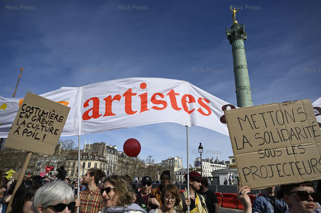 Légende : Les professionnels du secteur culturel en grève manifestent à l'appel de l'Intersyndicale du spectacle vivant pour dénoncer une politique d’austérité /// Cultural sector professionals on strike are demonstrating at the call of the Intersyndicale du spectacle vivant to denounce an austerity policy - Paris - 20/03/2025 - Photo © Lionel Préau +33 (0)6 68 12 83 77