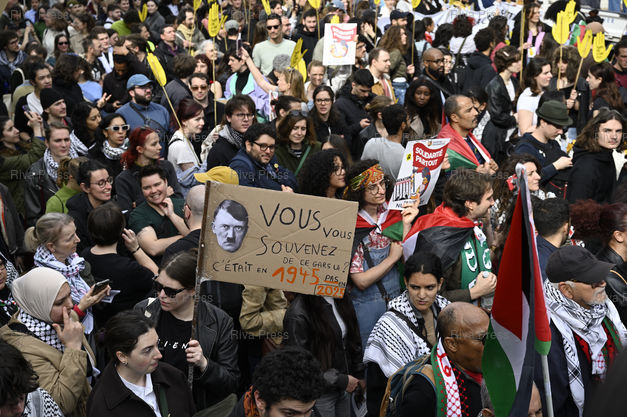 Légende : Manifestation contre le racisme et le fascisme à l'occasion de la journée internationale pour l'élimination de la discrimination raciale. Une manifestante porte une pancarte avec le portrait d'Hitler et l'inscription "Vous vous souvenez de ce gars là ? C'était en 1945, pas en 2025" /// Demonstration against racism and fascism on the occasion of the International Day for the Elimination of Racial Discrimination. A protester holds a placard with a portrait of Hitler and the words "Remember this guy ? That was 1945, not 2025." - Paris - 22/03/2025 - Photo © Lionel Préau +33 (0)6 68 12 83 77