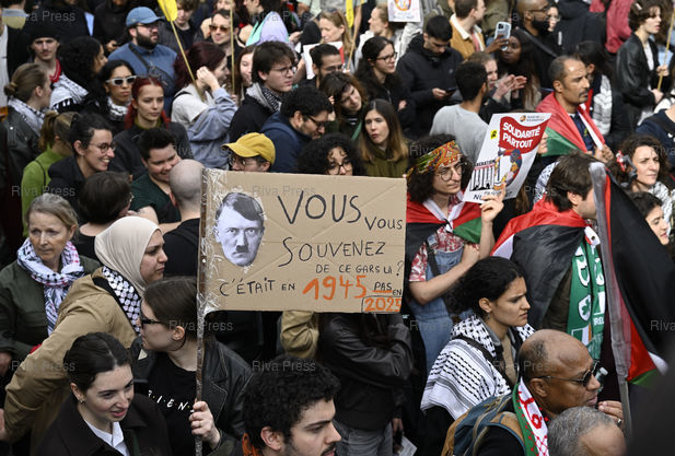 Légende : Manifestation contre le racisme et le fascisme à l'occasion de la journée internationale pour l'élimination de la discrimination raciale. Une manifestante porte une pancarte avec le portrait d'Hitler et l'inscription "Vous vous souvenez de ce gars là ? C'était en 1945, pas en 2025" /// Demonstration against racism and fascism on the occasion of the International Day for the Elimination of Racial Discrimination. A protester holds a placard with a portrait of Hitler and the words "Remember this guy ? That was 1945, not 2025." - Paris - 22/03/2025 - Photo © Lionel Préau +33 (0)6 68 12 83 77