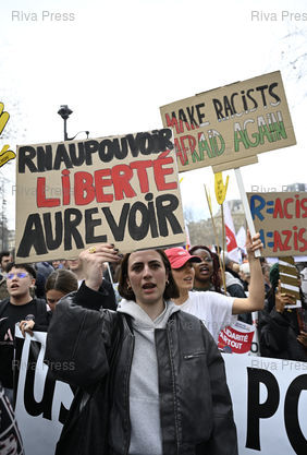 Légende : Manifestation contre le racisme et le fascisme à l'occasion de la journée internationale pour l'élimination de la discrimination raciale. Une manifestante porte une pancarte avec l'inscription "RN au pouvoir, liberté au revoir" /// Demonstration against racism and fascism on the occasion of the International Day for the Elimination of Racial Discrimination. A protester carries a placard reading "RN in power, goodbye to freedom" - Paris - 22/03/2025 - Photo © Lionel Préau +33 (0)6 68 12 83 77