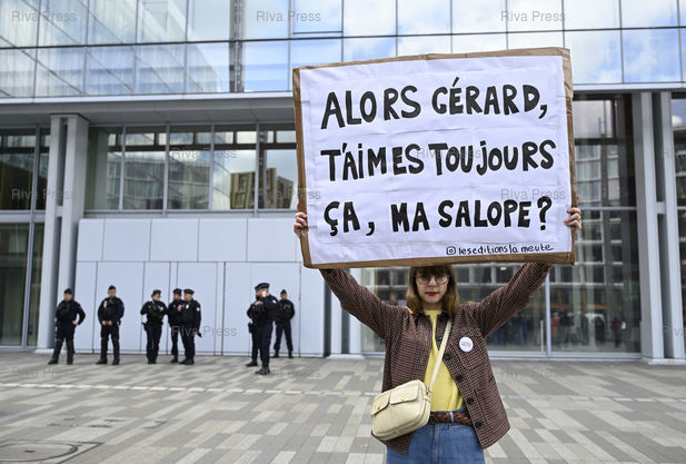 Légende : Des féministes manifestent devant le tribunal judiciaire de Paris avant le début du procès de l'acteur Gérard Depardieu, jugé pour agression sexuelle sur deux femmes lors d'un tournage /// Feminists protest outside the Paris courthouse ahead of the start of the trial of actor Gérard Depardieu, who is on trial for sexually assaulting two women during a film shoot - Paris - 24/03/2025 - Photo © Lionel Préau +33 (0)6 68 12 83 77