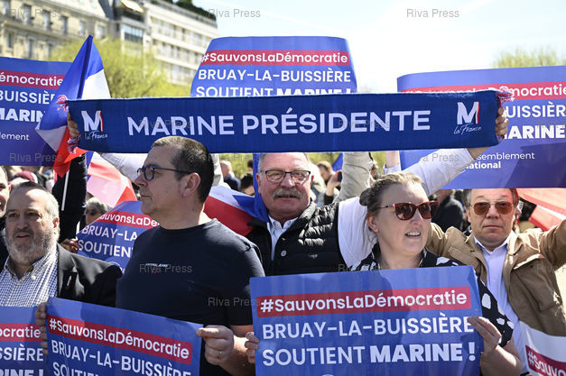 Légende : Meeting de soutien à Marine Le Pen à l'appel du Rassemblement national, une semaine après la condamnation de Marine Le Pen à 4 ans de prison et 5 ans d'inéligibilité dans l'affaire des assistants parlementaires européens - Place Vauban /// Rally in support of Marine Le Pen, called by the Rassemblement National far-right party, one week after Marine Le Pen was sentenced to four years in prison and five years of ineligibility in the European parliamentary assistants affair - Place Vauban - Paris - 06/04/2025 - Photo © Lionel Préau +33 (0)6 68 12 83 77