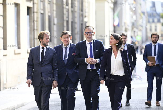 Légende : Le Parti socialiste à l'issue de son entretien avec le premier ministre Sébastien Lecornu dans le cadre de ses consultations sur le budget. Boris Vallaud, Président du groupe socialiste à l'Assemblée nationale - Patrick Kanner, Président du groupe socialiste au Sénat - Olivier Faure, Premier secrétaire du PS - Johanna Rolland, Première secrétaire déléguée du PS /// The Socialist Party following its meeting with Prime Minister Sébastien Lecornu as part of his consultations about the budget. Boris Vallaud, President of the Socialist Group in the National Assembly - Patrick Kanner, President of the Socialist Group in the Senate - Olivier Faure, First Secretary of the Socialist Party - Johanna Rolland, Deputy First Secretary of the Socialist Party - Paris - 17/09/2025 - Photo © Lionel Préau +33 (0)6 68 12 83 77