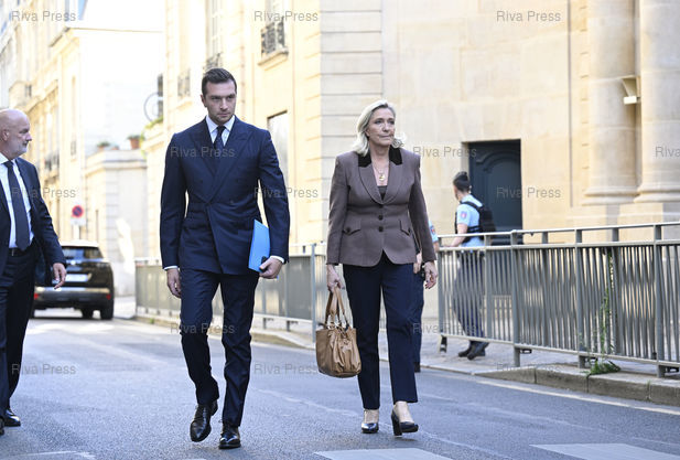 Légende : Jordan Bardella, président du RN, et Marine Le Pen, présidente du groupe RN à l'Assemblée nationale, à l'issue de leurentretien avec le premier ministre Sébastien Lecornu dans le cadre de ses consultations sur le budget /// Jordan Bardella, president of the Rassemblement National, and Marine Le Pen, president of the RN group in the National Assembly, following their meeting with Prime Minister Sébastien Lecornu as part of his consultations on the budget - Paris - 17/09/2025 - Photo © Lionel Préau +33 (0)6 68 12 83 77