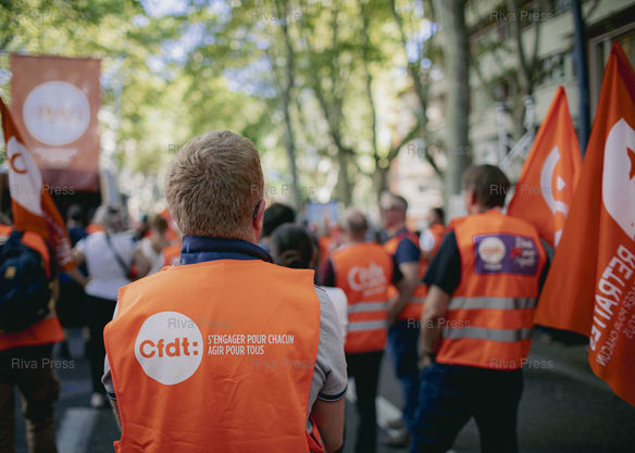 Légende : Toulouse, le 18 septembre 2025 - Cortège de la CFDT. Manifestation intersyndicale contre la politique du président et du gouvernement et pour peser sur les choix budgétaires à l'approche du projet de loi de finances pour 2026. PHOTO: Vincent NGUYEN / Riva Press ***