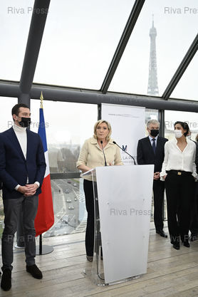 Légende : Marine Le Pen, candidate du Rassemblement national à l'élection présidentielle, présente ses voeux à la presse. En présence de Jordan Bardella, Jean-Paul Garraud, député européen, député européen, Laure Lavalette, porte-parole de campagne /// Marine Le Pen, candidate of the Rassemblement National Party to the presidential election, presents her wishes to the press. With Jordan Bardella, MEP, Jean-Paul Garraud, MEP, Laure Lavalette, campaign spokespersoin - Paris - 26/01/2022 - Photo © Lionel Préau +33 (0)6 68 12 83 77