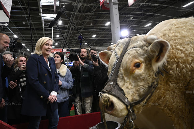 Légende : Marine Le Pen, candidate du Rassemblement national à l'élection présidentielle, visite le Salon de l'agriculture. Devant une vache charolaise /// Marine Le Pen, candidate of the Rassemblement National Party to the presidential elections, visits the Agricultural Show. In front of a Charolais cow - Paris - 02/03/2022 - Photo © Lionel Préau +33 (0)6 68 12 83 77