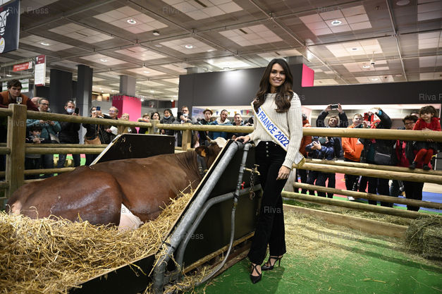 Légende : Diane Leyre, Miss France 2022, pose à côté de Neige, vache de race Abondance, égérie du Salon de l'agriculture /// Diane Leyre, Miss France 2022, poses next to Neige, Abondance cow, muse of the Agricultural Show - Paris - 02/03/2022 - Photo © Lionel Préau +33 (0)6 68 12 83 77