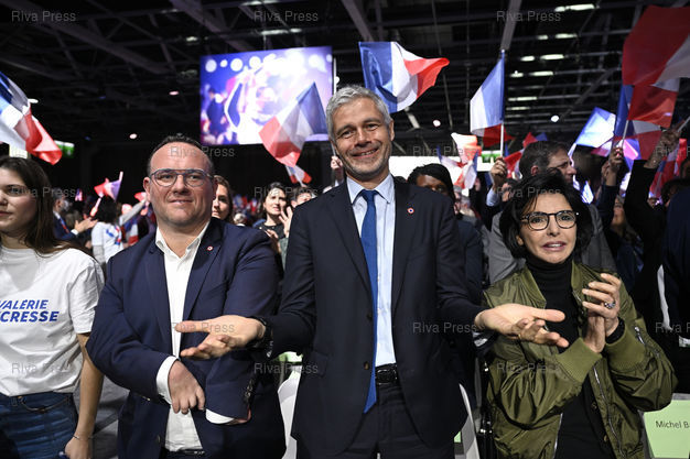 Légende : Meeting de Valérie Pécresse, candidate Les Républicains à l'élection présidentielle, Porte de Versailles. Laurent Wauquiez entre Damien Abad et Rachida Dati /// Meeting of Valérie Pécresse, candidate of Les Républicains party to the presidential elections, Porte de Versailles. Laurent Wauquiez between Damien Abad and Rachida Dati - Paris - 03/04/2022 - Photo © Lionel Préau +33 (0)6 68 12 83 77