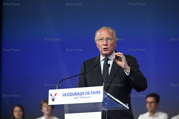 Légende : Meeting de Valérie Pécresse, candidate Les Républicains à l'élection présidentielle, Porte de Versailles. Brice Hortefeux /// Meeting of Valérie Pécresse, candidate of Les Républicains party to the presidential elections, Porte de Versailles. Brice Hortefeux - Paris - 03/04/2022 - Photo © Lionel Préau +33 (0)6 68 12 83 77