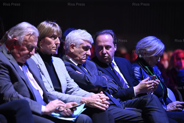 Légende : Meeting de Valérie Pécresse, candidate Les Républicains à l'élection présidentielle, Porte de Versailles. Les centristes Jean-Christophe Lagarde, président de l'UDI, et Hervé Morin, président Les Centristes, discutent en présence de Gérard Larcher, président du Sénat, et Valérie Létard /// Meeting of Valérie Pécresse, candidate of Les Républicains party to the presidential elections, Porte de Versailles. The centrists Jean-Christophe Lagarde, president of the UDI, and Hervé Morin, president Les Centristes, discuss in the presence of Gérard Larcher, president of the Senate, and Valérie Létard - Paris - 03/04/2022 - Photo © Lionel Préau +33 (0)6 68 12 83 77