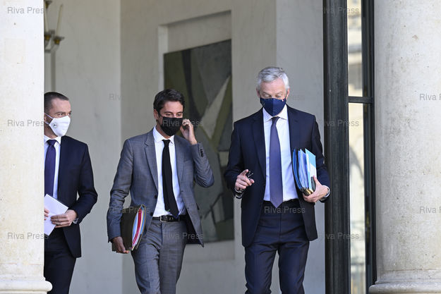 Légende : Conseil des ministres au palais de l'Elysée. Olivier Dussopt, ministre délégué chargé des Comptes publics - Gabriel Attal, porte-parole du Gouvernement - Bruno Le Maire, ministre de l'Économie, des Finances et de la Relance /// Cabinet meeting at the Elysee Palace. Olivier Dussopt, Junior Minister in charge of Public Accounts - Gabriel Attal, spokesperson of the Government - Bruno Le Maire, Minister of Economy, Finance and Recovery - Paris - 22/09/2021 - Photo © Lionel Préau +33 (0)6 68 12 83 77