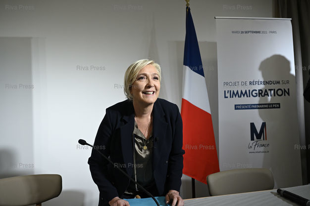 Légende : Marine Le Pen, candidate du Rassemblement national à l’élection présidentielle, présente son projet de référendum sur l'immigration /// Marine Le Pen, candidate of the Rassemblement National to the presidential election, presents her referendum project for immigration - Paris - 28/09/2021 - Photo © Lionel Préau +33 (0)6 68 12 83 77