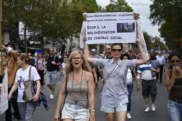 Légende : Manifestation contre l'extension du pass sanitaire, à l'appel de Florian Philippot, ex vice-président du Front national, fondateur du mouvement Les Patriotes et candidat à l'élection présidentielle /// Demonstration against the extension of the health pass, at the call of Florian Philippot, former vice-president of the far-right Front National Party, founder of the Les Patriotes movement and candidate for the presidential election - Paris - 21/08/2021 - Photo © Lionel Préau +33 (0)6 68 12 83 77