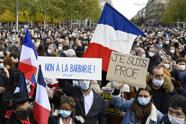 Légende : Rassemblement Place de la République en hommage à Samuel Paty, professeur d'histoire d'un collège de Conflans Saint-Honorine, en région parisienne, décapité vendredi par un terroriste russe tchétchène pour avoir montré à ses élèves les caricatures de Mahomet publiées par Charlie Hebdo. "Non à la barbarie !" "Je suis prof" /// Rally Place de la République in tribute to Samuel Paty, professor of history at a college in Conflans Saint-Honorine, in the Paris region, beheaded on Friday by a Chechen Russian terrorist for showing his students the caricatures of Muhammad published by Charlie Hebdo. "No to barbarism !" "I am a teacher" - Paris - 18/10/2020 - Photo © Lionel Préau +33 (0)6 68 12 83 77