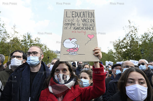 Légende : Rassemblement Place de la République en hommage à Samuel Paty, professeur d'histoire d'un collège de Conflans Saint-Honorine, en région parisienne, décapité vendredi par un terroriste russe tchétchène pour avoir montré à ses élèves les caricatures de Mahomet publiées par Charlie Hebdo. "L'éducation c'est le vaccin contre la violence et l'ignorance #JeSuisProf" /// Rally Place de la République in tribute to Samuel Paty, professor of history at a college in Conflans Saint-Honorine, in the Paris region, beheaded on Friday by a Chechen Russian terrorist for showing his students the caricatures of Muhammad published by Charlie Hebdo. "Education is the vaccine against violence and ignorance #IAmTeacher" - Paris - 18/10/2020 - Photo © Lionel Préau +33 (0)6 68 12 83 77