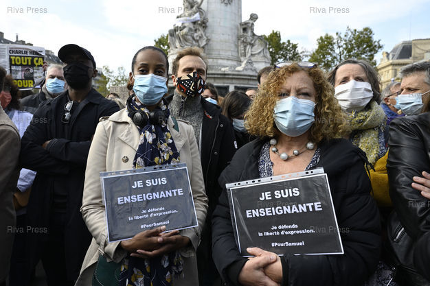 Légende : Rassemblement Place de la République en hommage à Samuel Paty, professeur d'histoire d'un collège de Conflans Saint-Honorine, en région parisienne, décapité vendredi par un terroriste russe tchétchène pour avoir montré à ses élèves les caricatures de Mahomet publiées par Charlie Hebdo. "Je suis enseignante. Je défends la liberté d'expression" /// Rally Place de la République in tribute to Samuel Paty, professor of history at a college in Conflans Saint-Honorine, in the Paris region, beheaded on Friday by a Chechen Russian terrorist for showing his students the caricatures of Muhammad published by Charlie Hebdo. "I am a teacher. I defend freedom of expression" - Paris - 18/10/2020 - Photo © Lionel Préau +33 (0)6 68 12 83 77